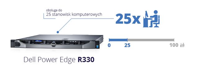 Serwer Dell PowerEdge R330 to drugi z serii jednoprocesorowych serwerów wejściowych, czyli takich, które zaprojektowane zostały z myślą o osobach rozpoczynających dopiero swoją przygodę z serwerami. Doskonale sprawdzi się w małych i średnich przedsiębiorstwach, których zespół nie przekracza 25 osób. Zadowoleni z niego będą również managerowie, którzy prowadzą lokalne oddziały dużych firm. Jako że Dell PowerEdge R330 jest wysoce skalowalny, doskonale sprawdzi się jako pierwszy serwer, którego parametry z łatwością będziemy mogli rozwijać. Wyposażony został w dwa zasilacze, co sprawia, że serwer podtrzyma swoje działanie nawet w przypadku ewentualnej awarii jednego z nich. Jest to szczególnie ważne w miejscach, gdzie od stabilnego działania serwera zależy prawidłowe funkcjonowanie przedsiębiorstwa. Z naszych doświadczeń wynika, że urządzenie jest najczęściej wdrażane w miejscach takich jak biura rachunkowe, kancelarie prawne, sklepy, restauracje czy niewielkie przychodnie zdrowia, a także zamiejscowe oddziały większych firm.